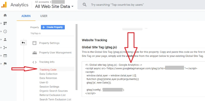 In the picture above you can see the way you can find the tracking code in the Admin section under the option Tracking info. You should insert this code in <head> section of your website.